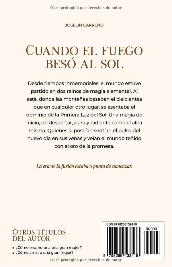 “Cuando el Fuego besó al Sol” narra la historia de dos reinos mágicos: uno en el este, ligado a la luz pura y radiante del sol (la Primera Luz), y otro en el oeste, dedicado al fuego intenso y constante (el Fuego Eterno). Estos reinos están separados por tierra y mar, en un equilibrio inestable. Se dice que algún día estas magias se encontrarían, provocando un poder inmenso que podría cambiar el mundo o destruirlo. Sin embargo, una reina ambiciosa en un reino lejano busca controlar las leyes naturales y unir estas fuerzas, poniendo en marcha una serie de eventos que llevarán a un gran encuentro entre el fuego y la luz. La historia anticipa el inicio de una nueva era, donde la historia y el destino serán definidos por la ambición y la unión de estos poderes ancestrales.